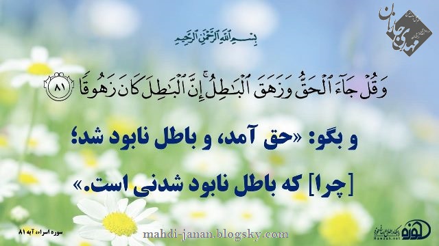 و بگو: «حق آمد، و باطل نابود شد؛ [چرا] که باطل نابود شدنی است.»